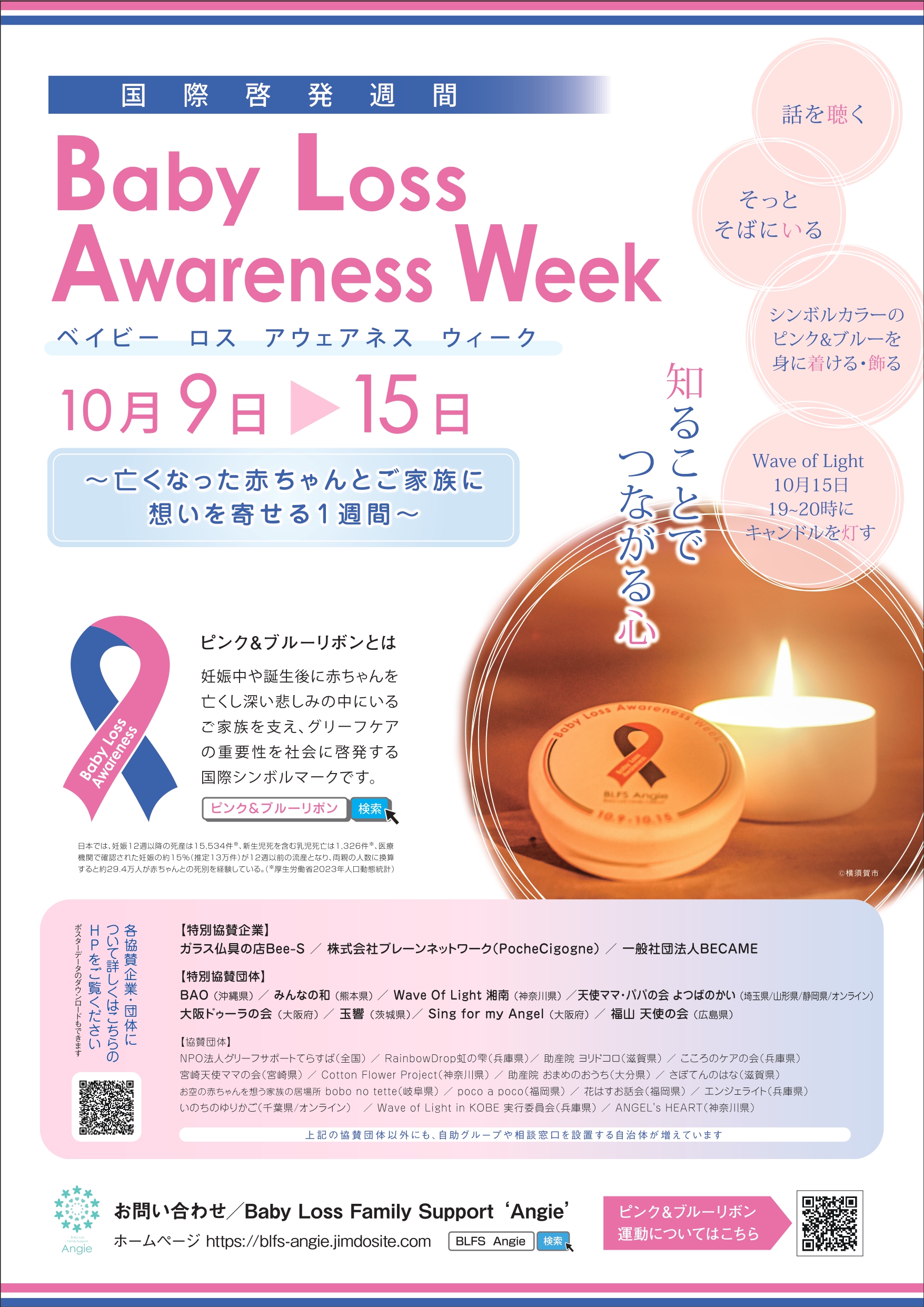 ピンク&ブルーリボンは、その深い悲しみの中にいるご家族を支え、グリーフケアの重要性を社会に啓発する国際シンボルマークです。