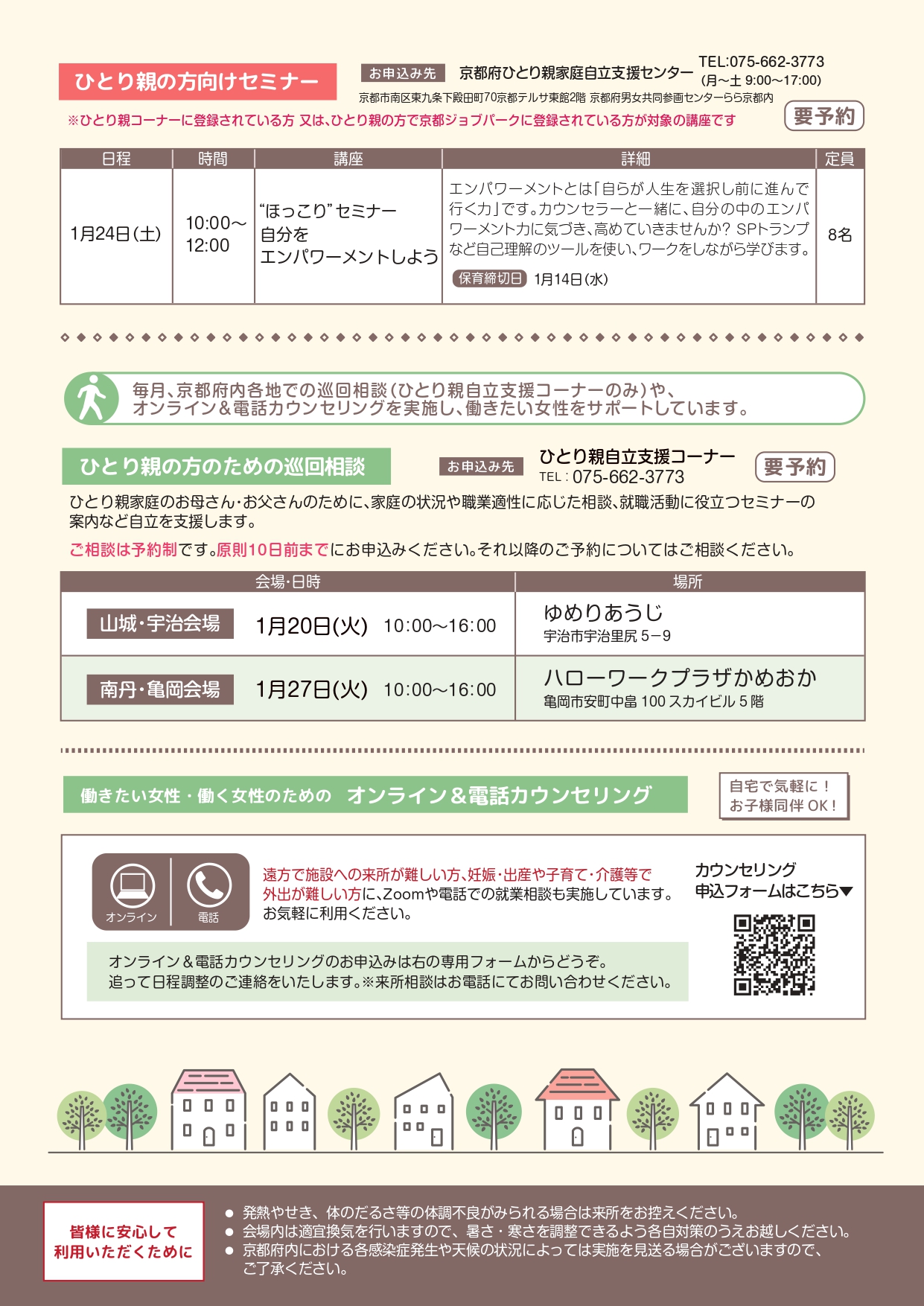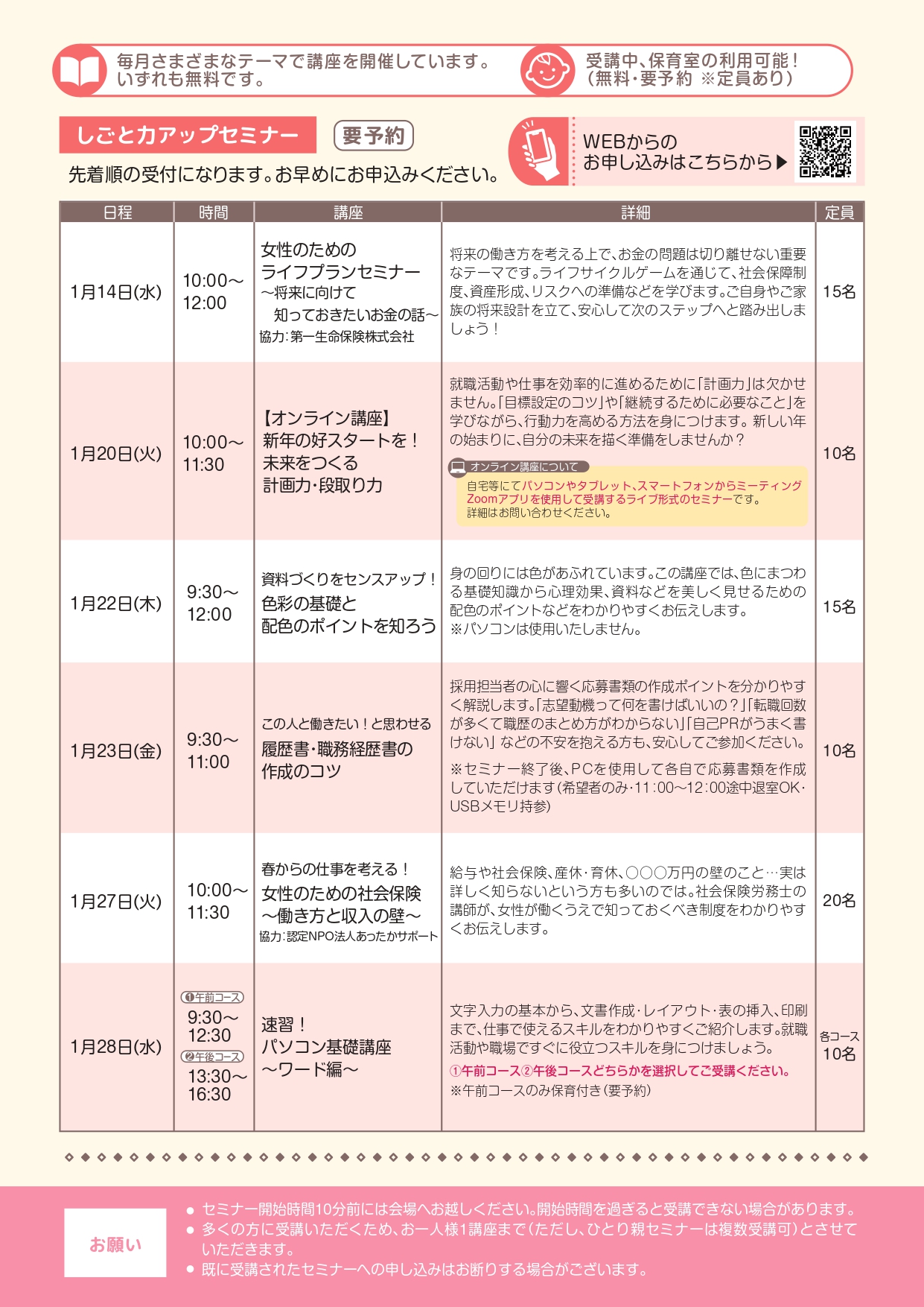 【セミナー】マザーズジョブカフェ 就職・転職を目指す女性のためのしごと力アップセミナー(1月)