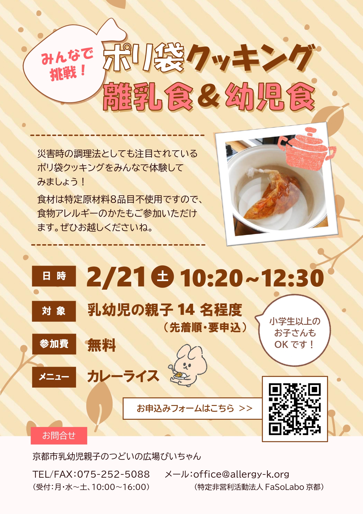 食材は特定原材料8品目不使用ですので、食物アレルギーのかたもご参加いただけます。ぜひお越しくださいね。
