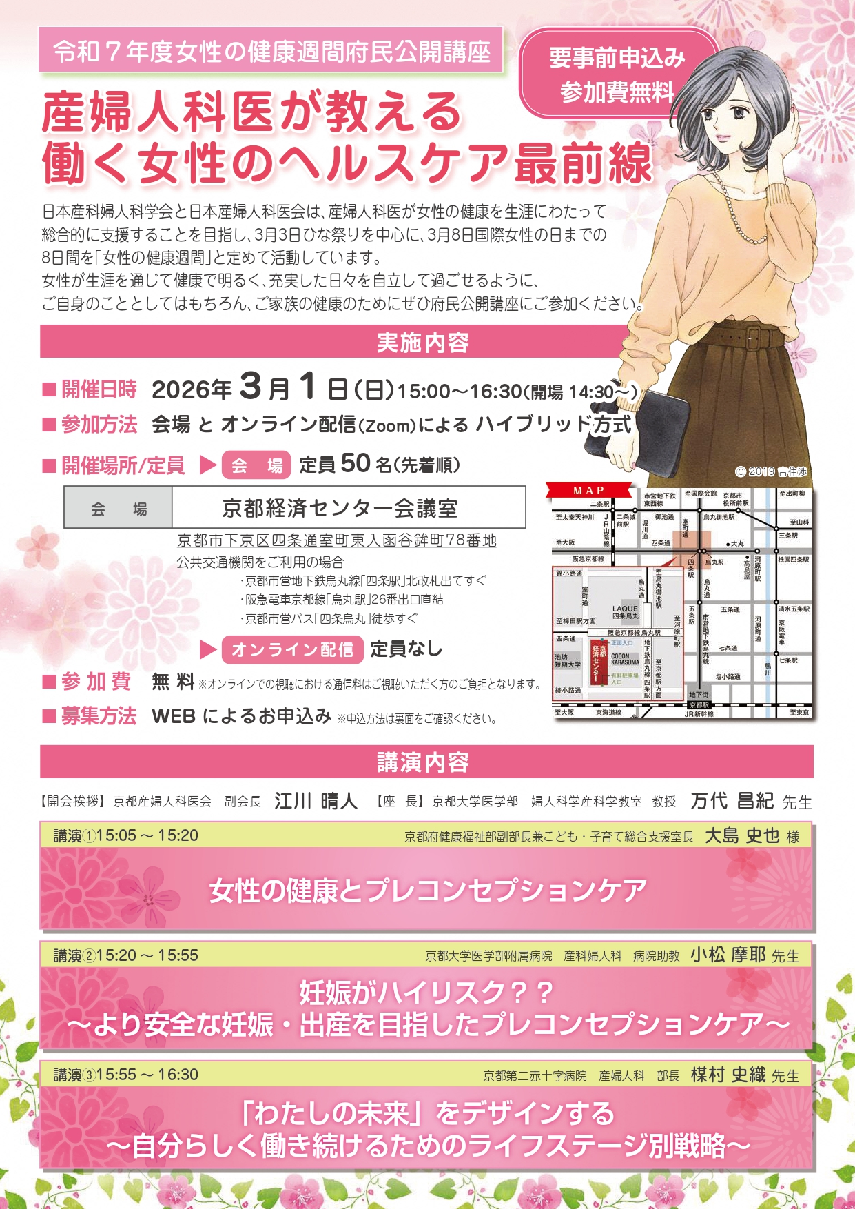 女性が生涯を通じて健康で明るく、充実した日々を自立して過ごせるように、ご自身のこととしてはもちろん、ご家族の健康のためにぜひ府民公開講座にご参加ください。