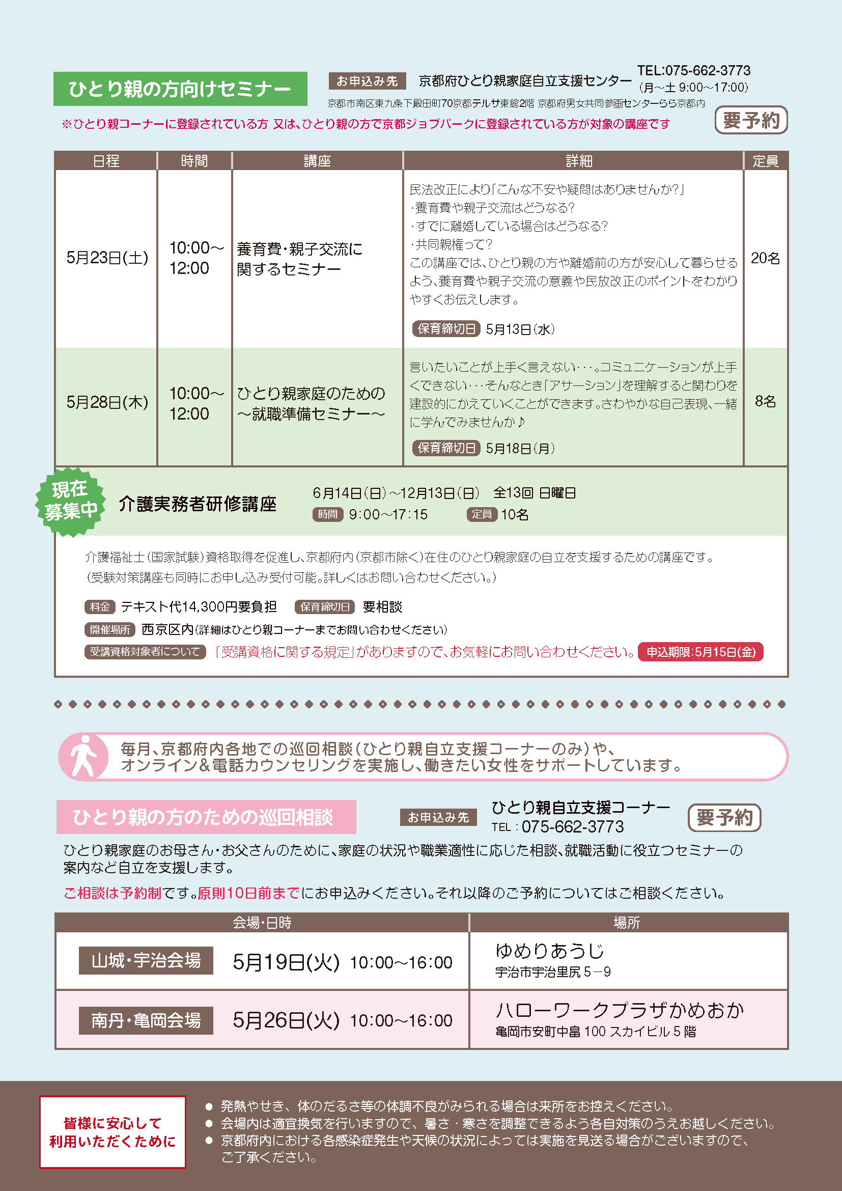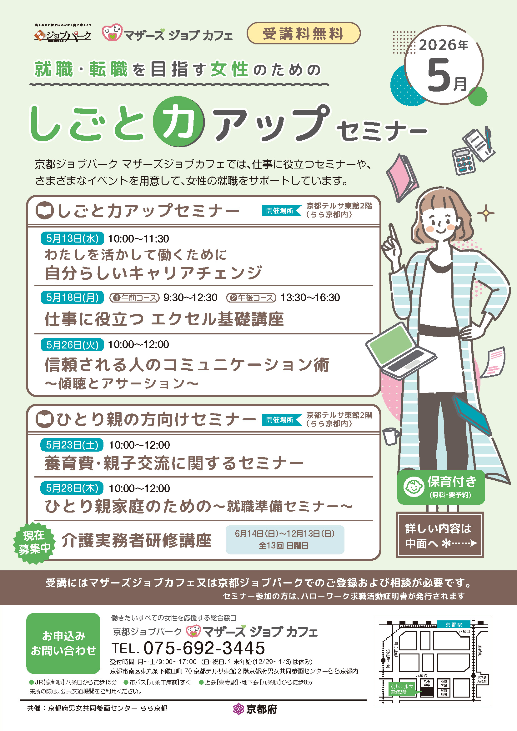 京都ジョブパークマザーズジョブカフェでは、仕事に役立つセミナーや、さまざまなイベントを用意して、女性の就職をサポートしています。