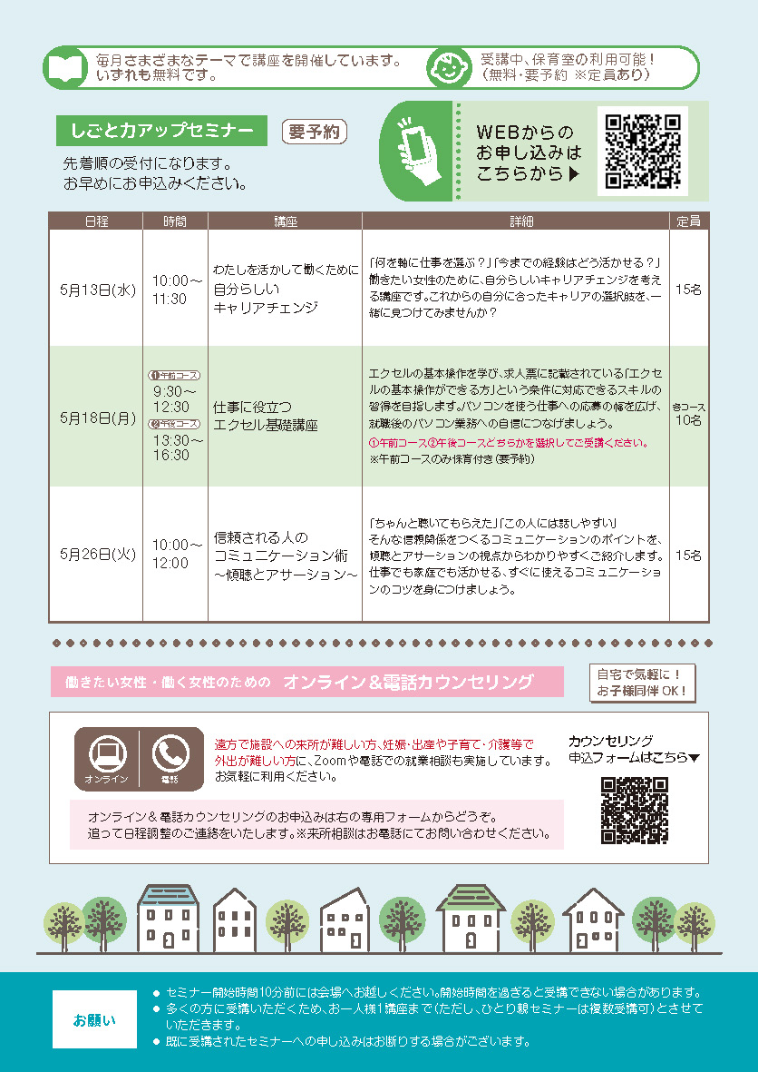 【セミナー】マザーズジョブカフェ 就職・転職を目指す女性のためのしごと力アップセミナー(5月)
