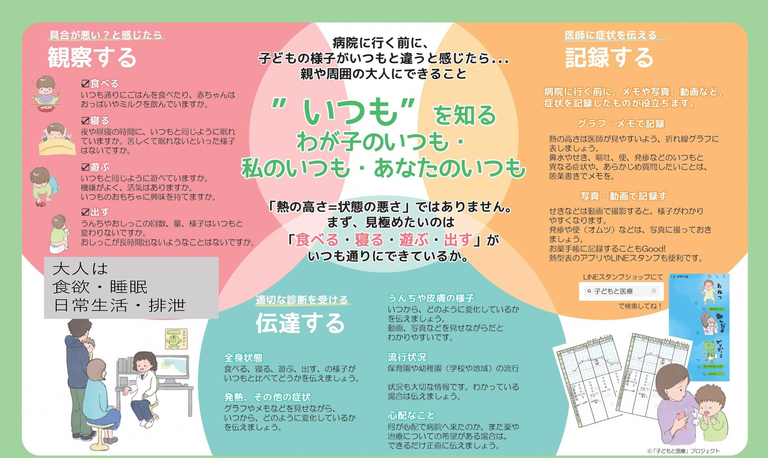 病院に行った時に、適切な診断を受けるために観察や記録したことを、伝達することが大切になります。