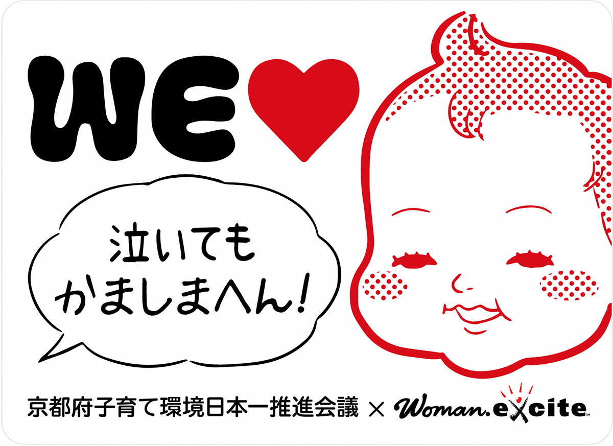 公共の場で泣き始めた赤ちゃんを、懸命に泣き止ませようと焦るママの姿をきっかけに始まった取り組みで、周囲が「焦らなくても大丈夫」「泣いても気にしませんよ」という受容の気持ちをステッカー等で見える化することでママ・パパを優しく見守り、子育てにあたたかな風土をつくります。京都府子育て環境日本一推進会議では、オール京都でこの取り組みに賛同しています。