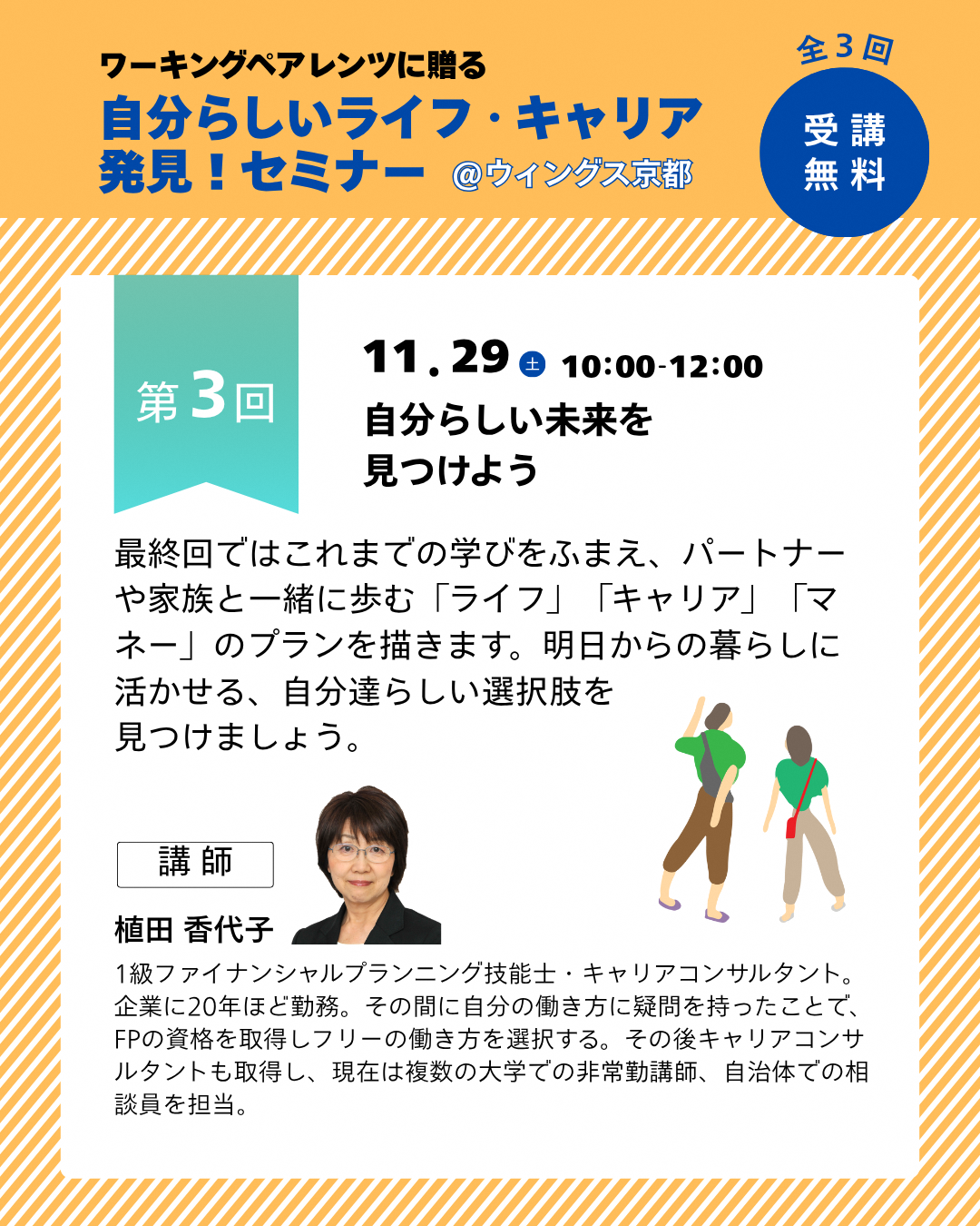 最終回ではこれまでの学びをふまえ、パートナーや家族と一緒に歩む「ライフ」「キャリア」「マネー」のプランを描きます。明日からの暮らしに活かせる、自分達らしい選択肢を見つけましょう。
