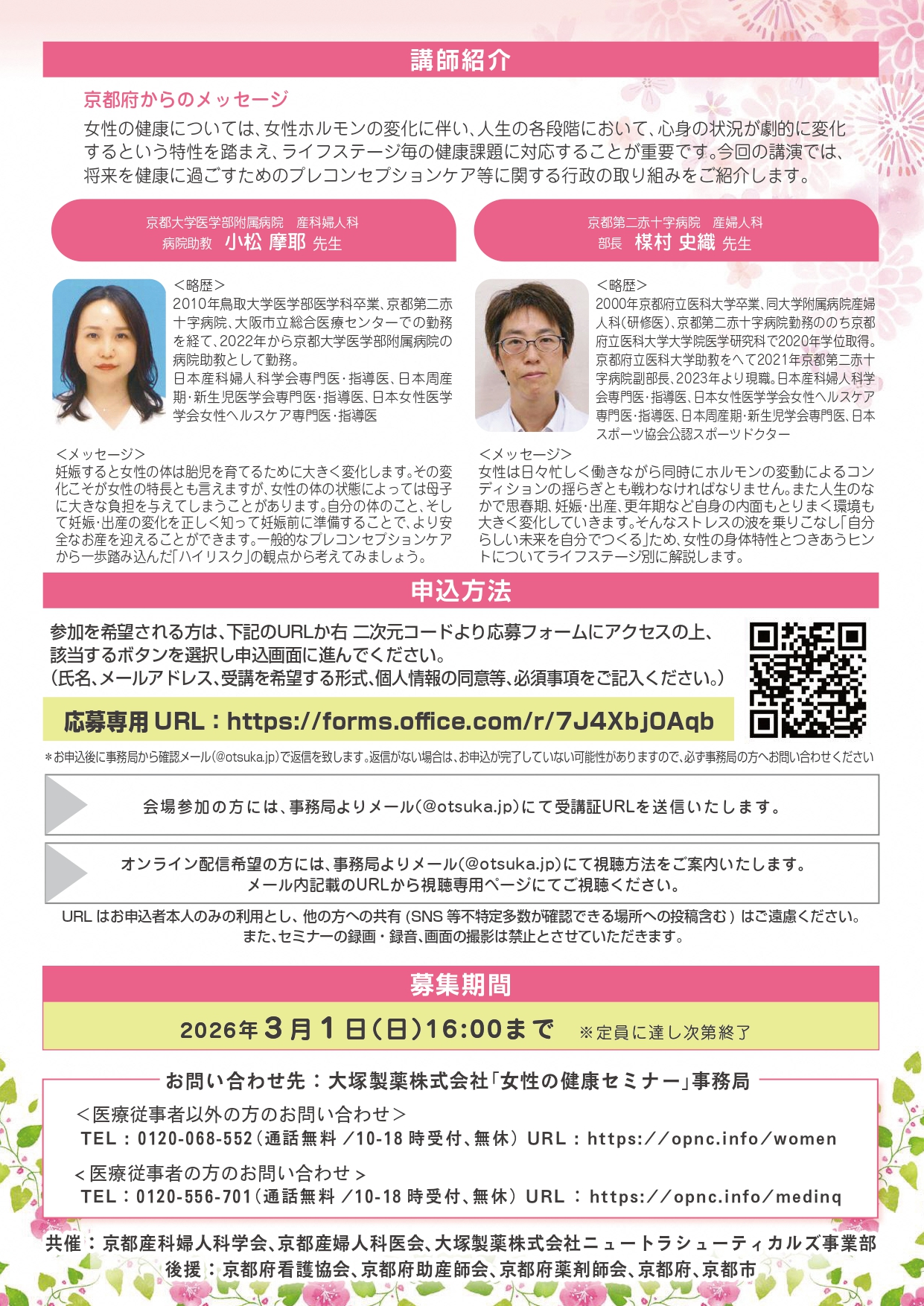 女性が生涯を通じて健康で明るく、充実した日々を自立して過ごせるように、ご自身のこととしてはもちろん、ご家族の健康のためにぜひ府民公開講座にご参加ください。
