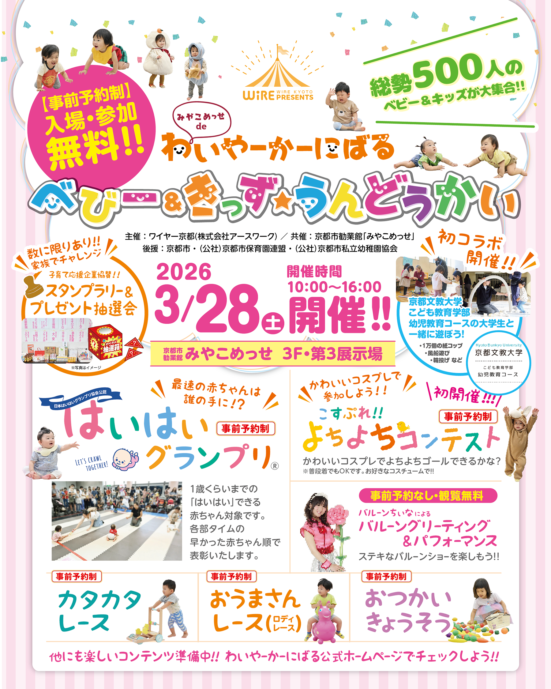 3月28日(土)京都市勧業館みやこめっせにて、赤ちゃんから未就学のお子さま・電車好きな小学生とそのご家族さまを対象に、1日中楽しめる、思い出に残るイベント「みやこめっせ de わいやーかーにばる」を開催します。