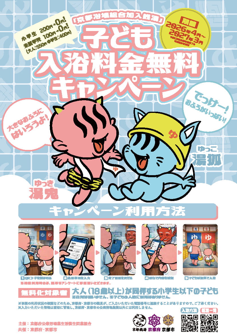 「京都府公衆浴場業生活衛生同業組合」に加入の府内銭湯では、小学生以下の子どもの入浴料金(通常:小学生200円、乳幼児100円)が無料になります。